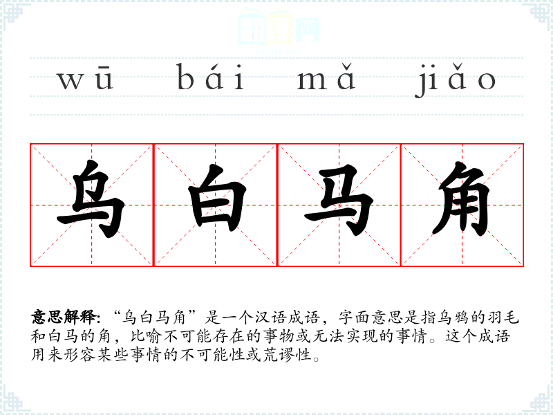 “乌白马角”是一个汉语成语,字面意思是指乌鸦的羽毛和白马的角,比喻不可能存在的事物或无法实现的事情。这个成语用来形容某些事情的不可能性或荒谬性。