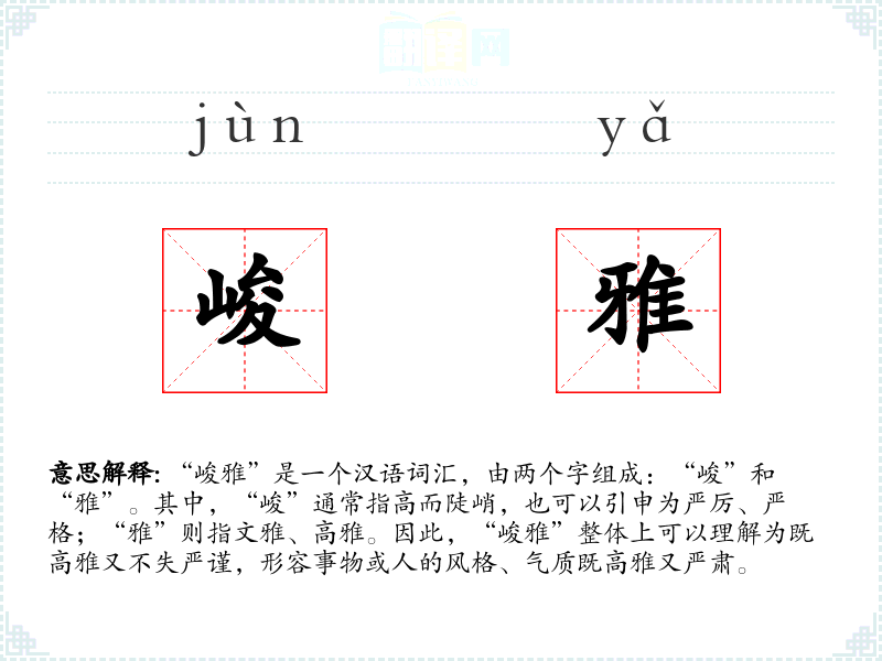 “峻雅”作为一个复合词,其构成部分“峻”和“雅”在古代汉语中已有使用。随着语言的发展,这两个字结合在一起,形成了新的词汇,用以描述更加具体和复杂的概念。