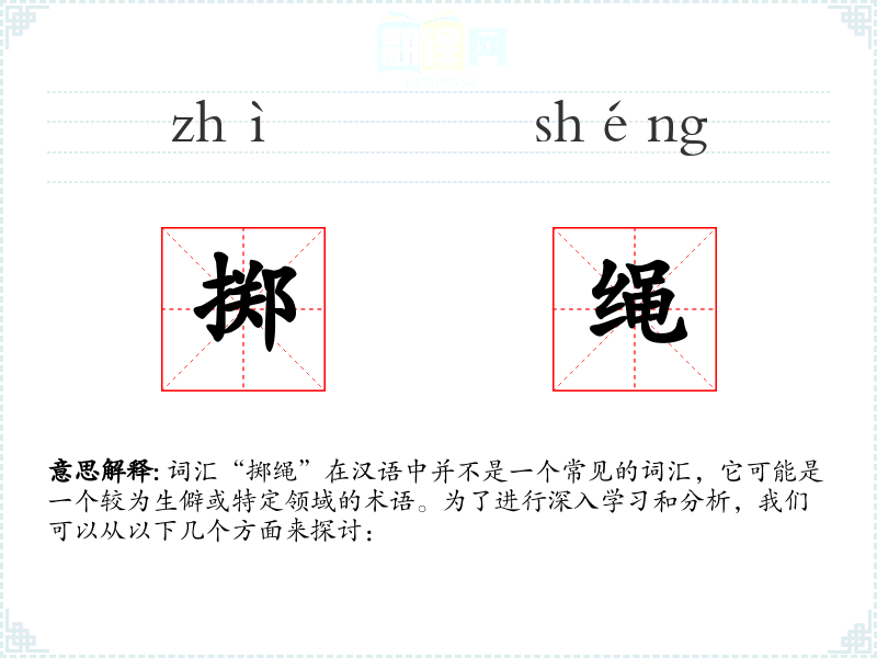 词汇“掷绳”在汉语中并不是一个常见的词汇,它可能是一个较为生僻或特定领域的术语。为了进行深入学习和分析,我们可以从以下几个方面来探讨: