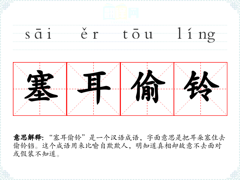 “塞耳偷铃”是一个汉语成语,字面意思是把耳朵塞住去偷铃铛。这个成语用来比喻自欺欺人,明知道真相却故意不去面对或假装不知道。