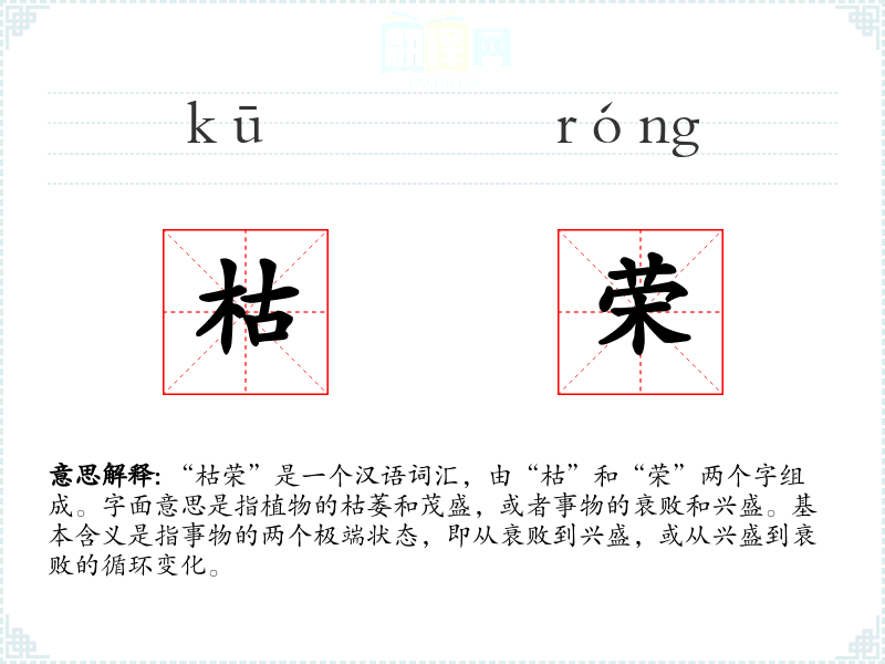 同义词“兴衰”和“盛衰”与“枯荣”意思相近,都指事物的变化过程。反义词“稳定”和“恒常”则与“枯荣”形成对比,强调不变和持续的状态。