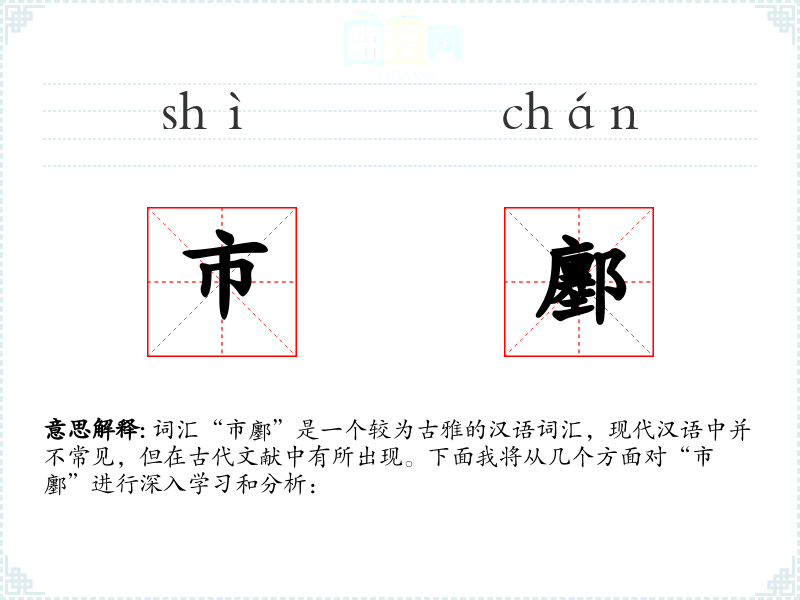 词汇“市鄽”是一个较为古雅的汉语词汇,现代汉语中并不常见,但在古代文献中有所出现。下面我将从几个方面对“市鄽”进行深入学*和分析: