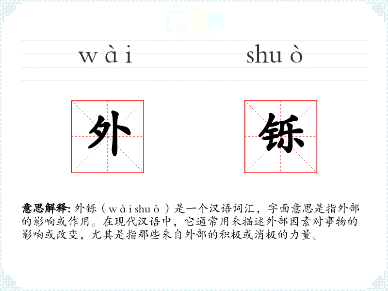 外铄(wài shuò)是一个汉语词汇,字面意思是指外部的影响或作用。在现代汉语中,它通常用来描述外部因素对事物的影响或改变,尤其是指那些来自外部的积极或消极的力量。