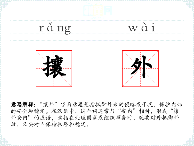 在英语中,“攘外”可以对应为“defend against external threats”或“ward off foreign invasions”,虽然在表达上有所不同,但核心意义相似。