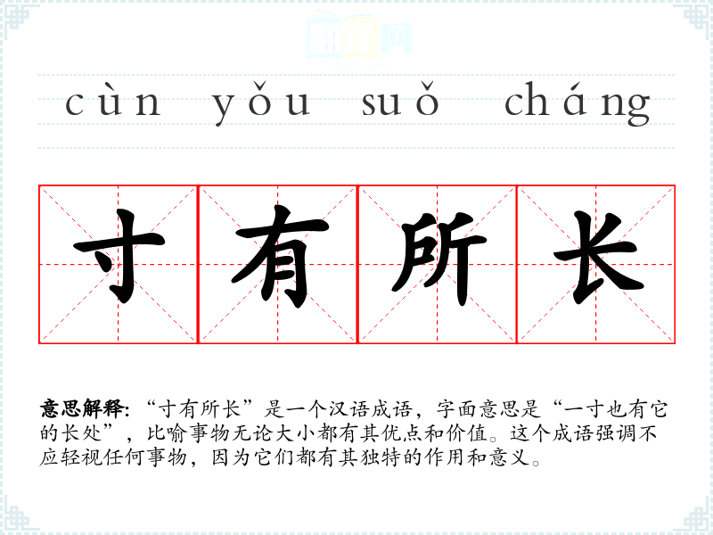“寸有所长”是一个汉语成语,字面意思是“一寸也有它的长处”,比喻事物无论大小都有其优点和价值。这个成语强调不应轻视任何事物,因为它们都有其独特的作用和意义。