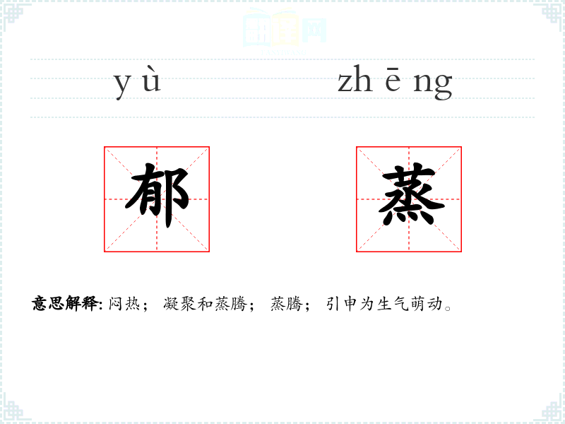 闷热; 凝聚和蒸腾; 蒸腾; 引申为生气萌动。