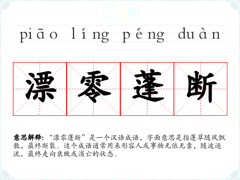“漂零蓬断”这个成语在*文化中具有丰富的象征意义,它不仅描绘了物质上的无依无靠,也反映了精神上的孤独和无奈。在语言学和表达中,理解和运用这样的成语可以丰富我们的表达方式,增强语言的深度和美感。