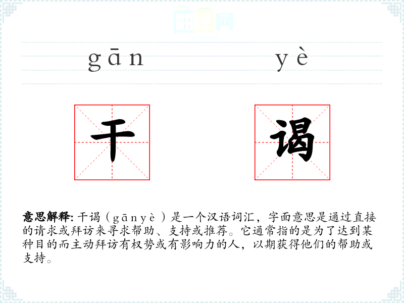 干谒(gān yè)是一个汉语词汇,字面意思是通过直接的请求或拜访来寻求帮助、支持或推荐。它通常指的是为了达到某种目的而主动拜访有权势或有影响力的人,以期获得他们的帮助或支持。