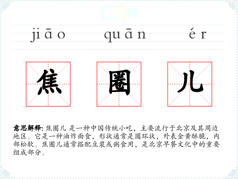 - 同义词:油条(另一种**传统油炸面食,形状和焦圈儿不同,但都是早餐食品)