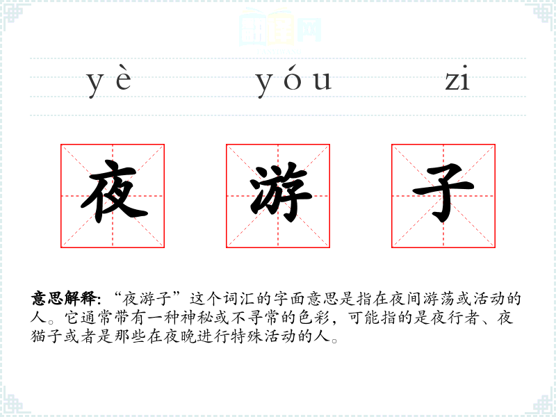 “夜游子”这个词汇的字面意思是指在夜间游荡或活动的人。它通常带有一种神秘或不寻常的色彩,可能指的是夜行者、夜猫子或者是那些在夜晚进行特殊活动的人。