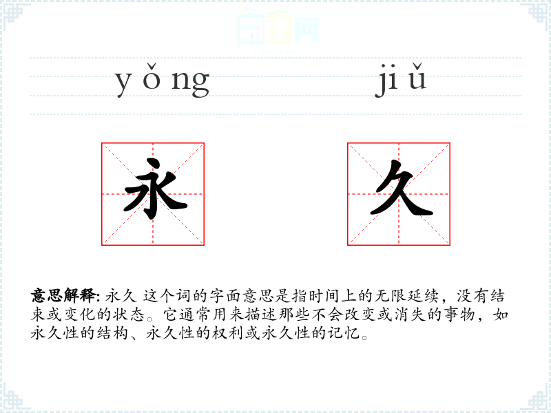 永久 这个词的字面意思是指时间上的无限延续,没有结束或变化的状态。它通常用来描述那些不会改变或消失的事物,如永久性的结构、永久性的权利或永久性的记忆。