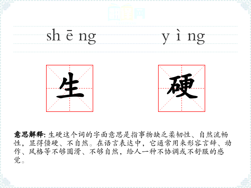 生硬这个词的字面意思是指事物缺乏柔韧性、自然流畅性,显得僵硬、不自然。在语言表达中,它通常用来形容言辞、动作、风格等不够圆滑、不够自然,给人一种不协调或不舒服的感觉。