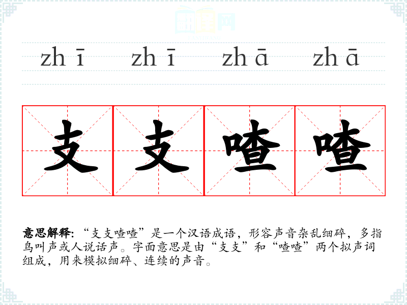 “支支喳喳”是一个汉语成语,形容声音杂乱细碎,多指鸟叫声或人说话声。字面意思是由“支支”和“喳喳”两个拟声词组成,用来模拟细碎、连续的声音。
