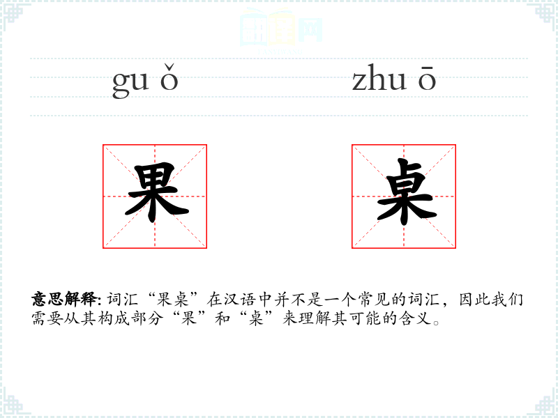 词汇“果桌”在汉语中并不是一个常见的词汇,因此我们需要从其构成部分“果”和“桌”来理解其可能的含义。