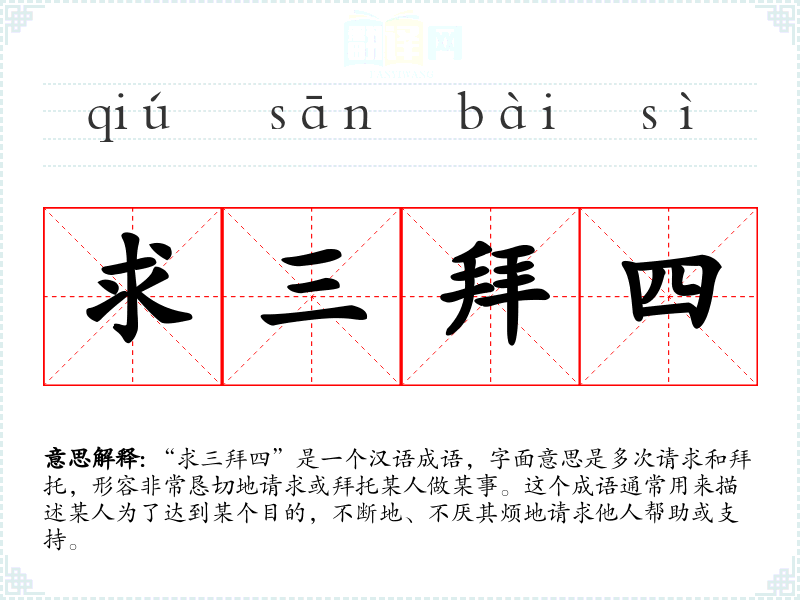“求三拜四”是一个汉语成语,字面意思是多次请求和拜托,形容非常恳切地请求或拜托某人做某事。这个成语通常用来描述某人为了达到某个目的,不断地、不厌其烦地请求他人帮助或支持。