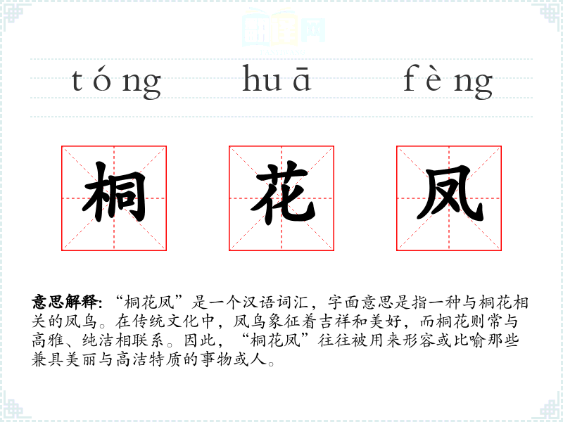 “桐花凤”这个词汇的词源可能来源于古代的神话传说,其中凤鸟与桐花的结合象征着吉祥和美好。随着时间的推移,这个词汇逐渐被用于文学和艺术创作中,用以形容那些具有高洁和美丽特质的事物或人。