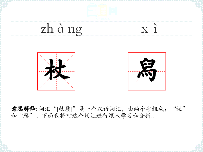 词汇“[杖屦]”是一个汉语词汇,由两个字组成:“杖”和“屦”。下面我将对这个词汇进行深入学*和分析。