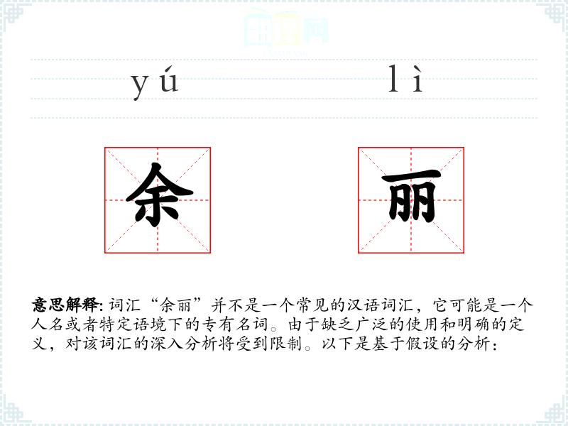 词汇“余丽”并不是一个常见的汉语词汇,它可能是一个人名或者特定语境下的专有名词。由于缺乏广泛的使用和明确的定义,对该词汇的深入分析将受到限制。以下是基于假设的分析: