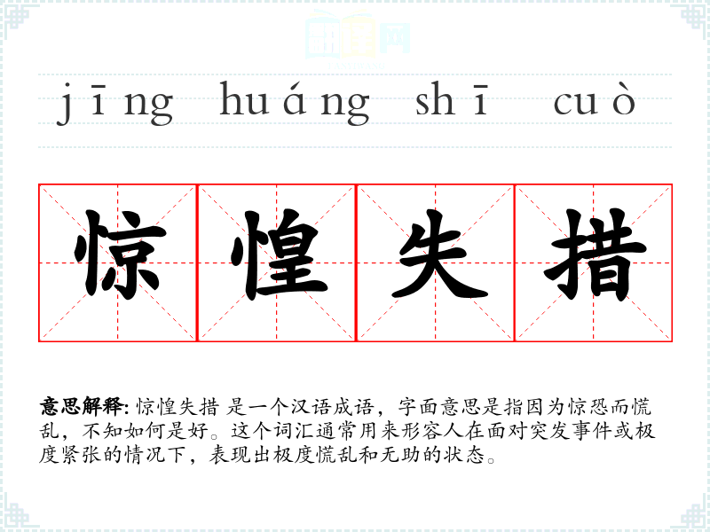 惊惶失措 是一个汉语成语,字面意思是指因为惊恐而慌乱,不知如何是好。这个词汇通常用来形容人在面对突发**或极度紧张的情况下,表现出极度慌乱和无助的状态。