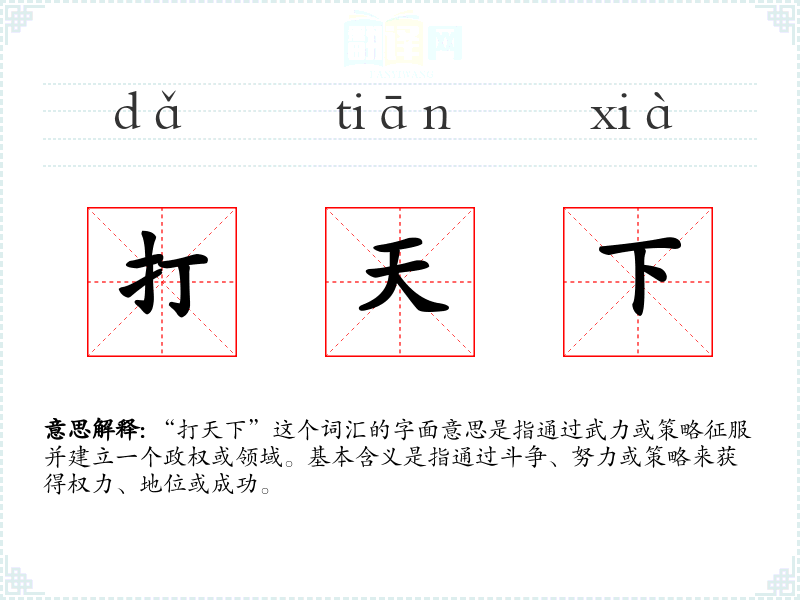 “打天下”这个词汇的字面意思是指通过武力或策略征服并建立一个政权或领域。基本含义是指通过斗争、努力或策略来获得权力、地位或成功。