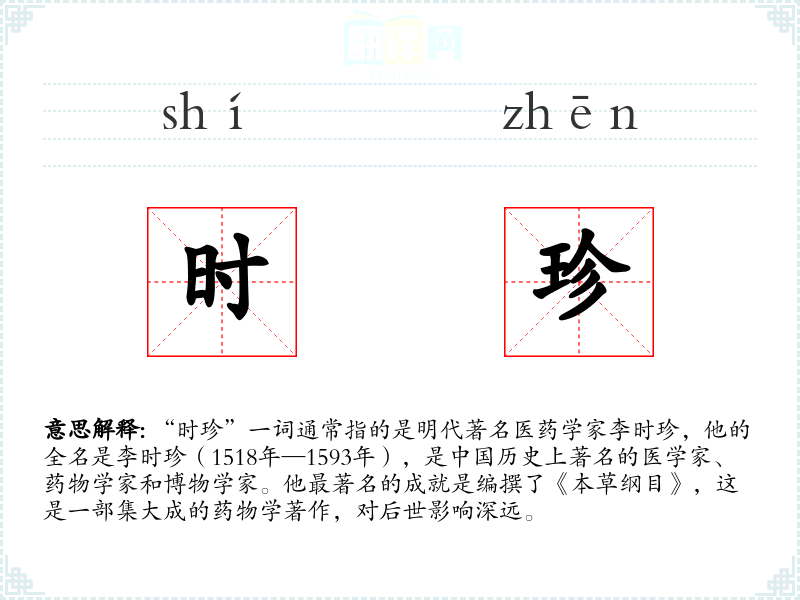 同义词:药圣(指李时珍的尊称)、医圣(指在医学领域有卓越贡献的人) 反义词:无(因为“时珍”特指李时珍,没有直接的反义词)