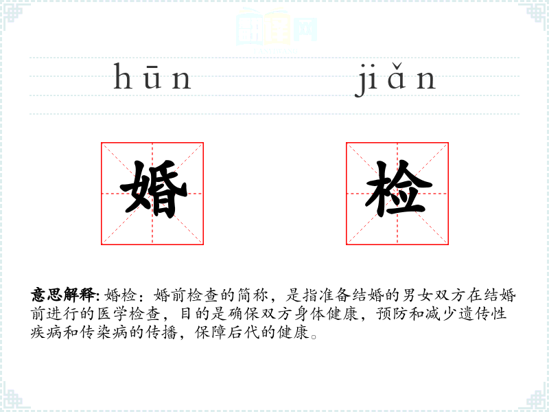 婚检:婚前检查的简称,是指准备结婚的男女双方在结婚前进行的医学检查,目的是确保双方身体健康,预防和减少遗传性疾病和传染病的传播,保障后代的健康。