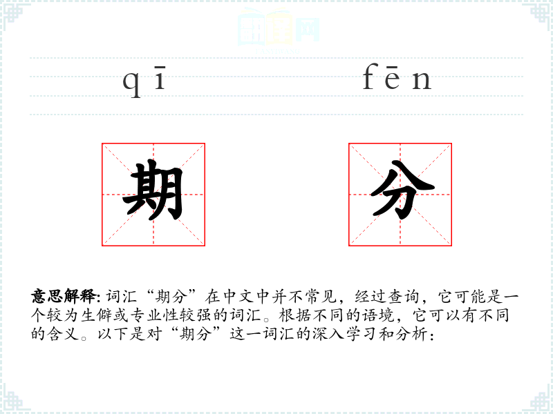 词汇“期分”在中文中并不常见,经过查询,它可能是一个较为生僻或专业性较强的词汇。根据不同的语境,它可以有不同的含义。以下是对“期分”这一词汇的深入学习和分析:
