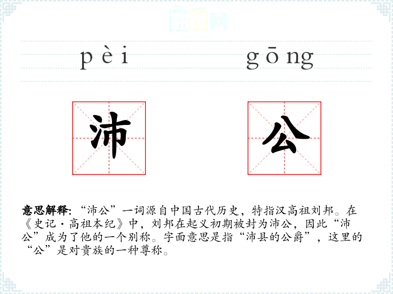 “沛公”一词源自**古代历史,特指汉高祖刘邦。在《史记·高祖本纪》中,刘邦在起义初期被封为沛公,因此“沛公”成为了他的一个别称。字面意思是指“沛县的公爵”,这里的“公”是对贵族的一种尊称。