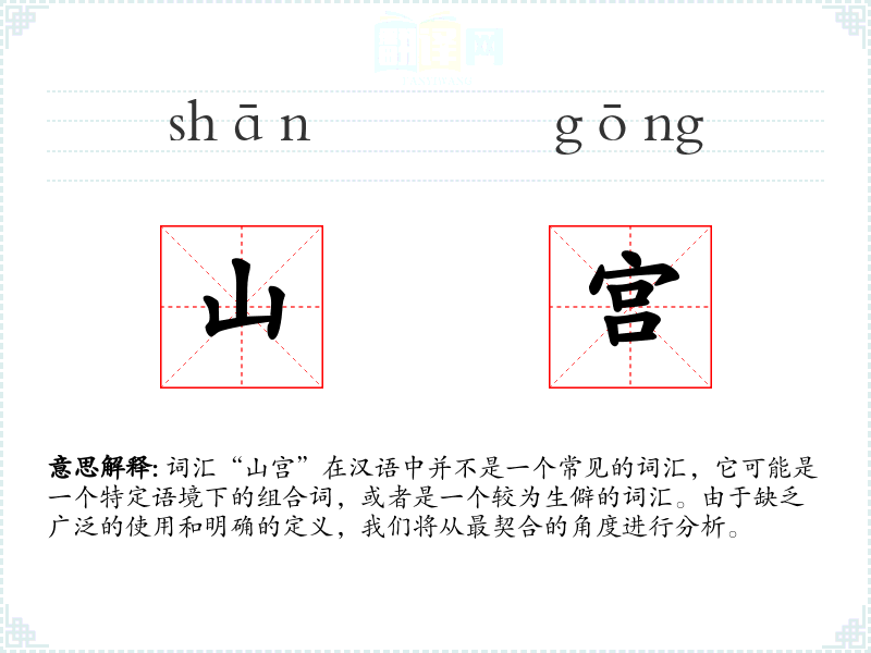 词汇“山宫”在汉语中并不是一个常见的词汇,它可能是一个特定语境下的组合词,或者是一个较为生僻的词汇。由于缺乏广泛的使用和明确的定义,我们将从最契合的角度进行分析。