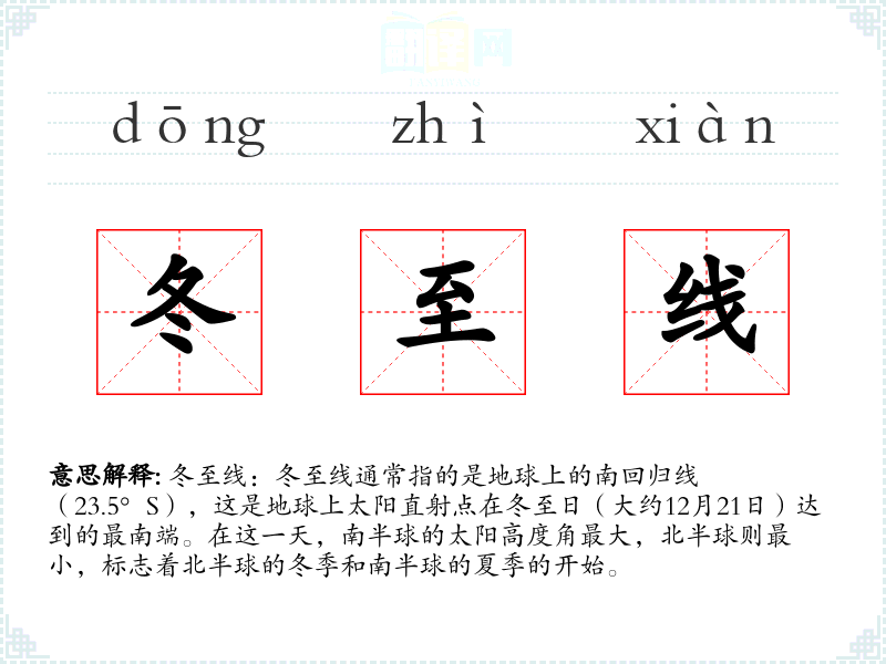 - 口语:在日常对话中,冬至线可能不太常用,除非在讨论天文或地理话题时。