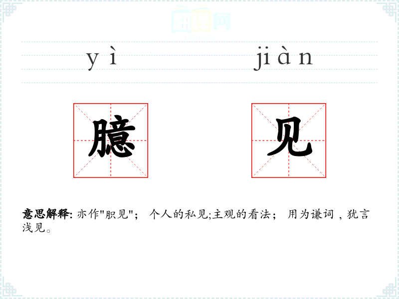 亦作"胑见"; 个人的私见;主观的看法; 用为谦词﹐犹言浅见。