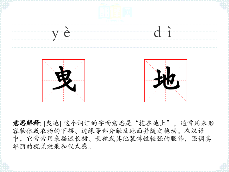 - 专业领域:在时尚设计或服装制作领域,“曳地”可能被用来描述特定款式的设计细节,如晚礼服或婚纱的设计。
