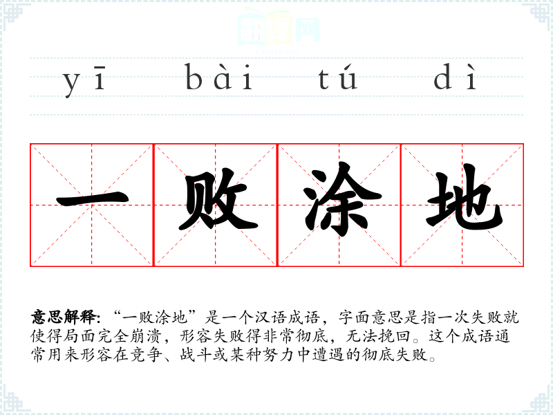 “一败涂地”是一个汉语成语,字面意思是指一次失败就使得局面完全崩溃,形容失败得非常彻底,无法挽回。这个成语通常用来形容在竞争、战斗或某种努力中遭遇的彻底失败。