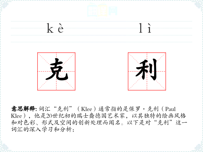 词汇“克利”(Klee)通常指的是保罗·克利(Paul Klee),他是20世纪初的瑞士裔德国艺术家,以其独特的绘画风格和对色彩、形式及空间的创新处理而闻名。以下是对“克利”这一词汇的深入学习和分析: