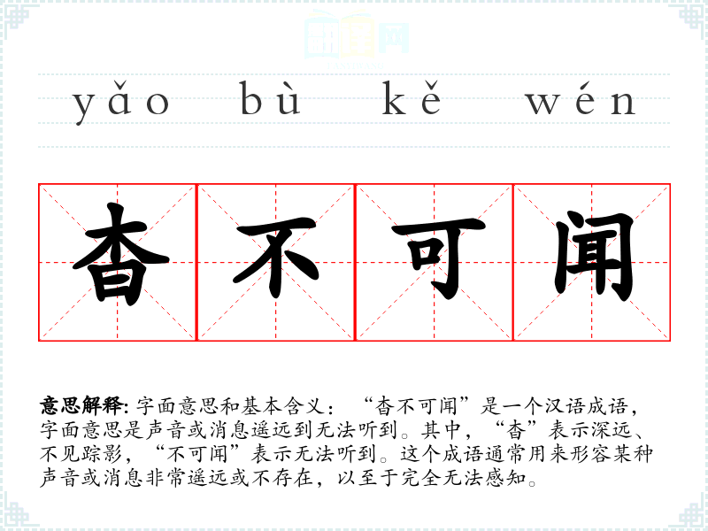 字面意思和基本含义: “杳不可闻”是一个汉语成语,字面意思是声音或消息遥远到无法听到。其中,“杳”表示深远、不见踪影,“不可闻”表示无法听到。这个成语通常用来形容某种声音或消息非常遥远或不存在,以至于完全无法感知。