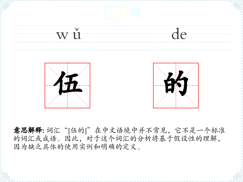 词汇“[伍的]”在中文语境中并不常见,它不是一个标准的词汇或成语。因此,对于这个词汇的分析将基于假设性的理解,因为缺乏具体的使用实例和明确的定义。