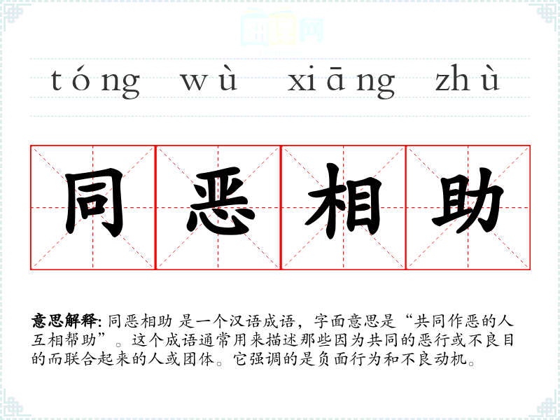 在文化中,同恶相助** 这个成语常常用来批评和警示那些因为不良目的而结盟的行为。在社会背景中,这个词汇可能用来分析和批判一些不良社会现象,如腐败、犯罪等。