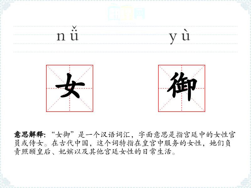 “女御”是一个汉语词汇,字面意思是指宫廷中的女性官员或侍女。在古代**,这个词特指在皇宫中服务的女性,她们负责照顾皇后、妃嫔以及其他宫廷女性的日常生活。
