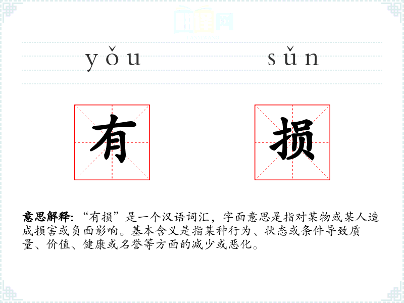 “有损”由“有”和“损”两个字组成。“有”表示存在或拥有,“损”表示减少或损害。在古代汉语中,“损”已有损害的含义,如《左传》中有“损人利己”的说法。随着语言的发展,“有损”作为一个固定搭配,广泛用于现代汉语中。