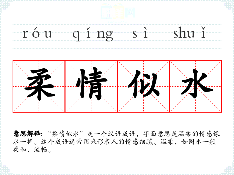 “柔情似水”是一个汉语成语,字面意思是温柔的情感像水一样。这个成语通常用来形容人的情感细腻、温柔,如同水一般柔和、流畅。