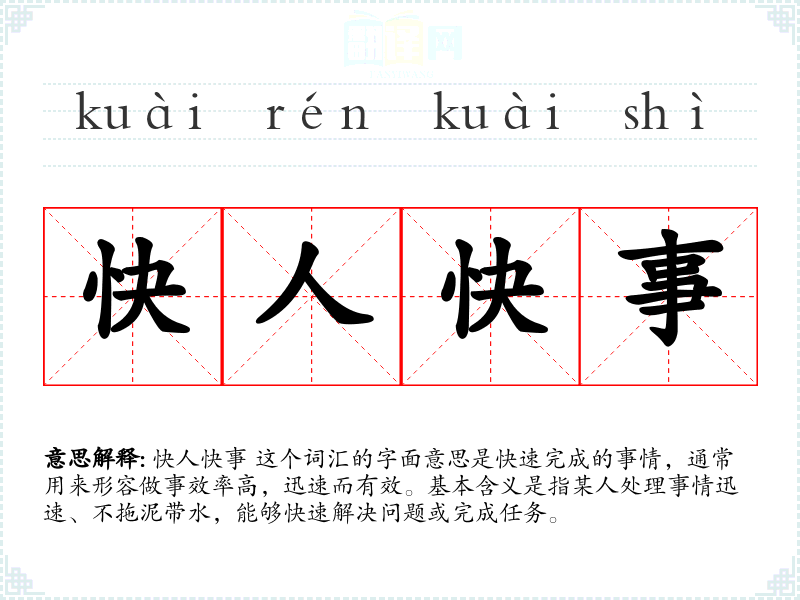 - 文学:在文学作品中,这个词汇可能用来形容主人公的行动力强,如“他是个快人快事的人,总是能在最短的时间内解决问题。”