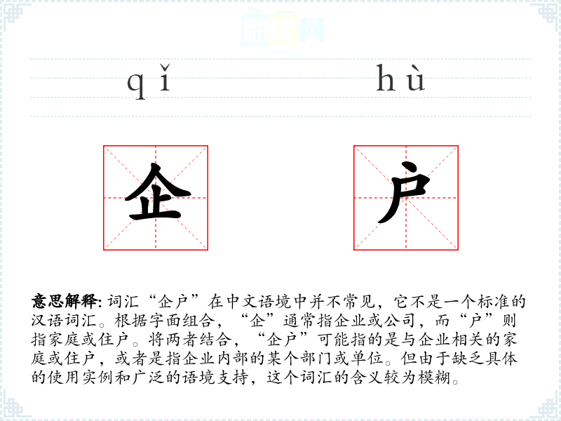 - 字面意思:结合“企”和“户”的字面意思,“企户”可能指的是与企业相关的家庭或住户。