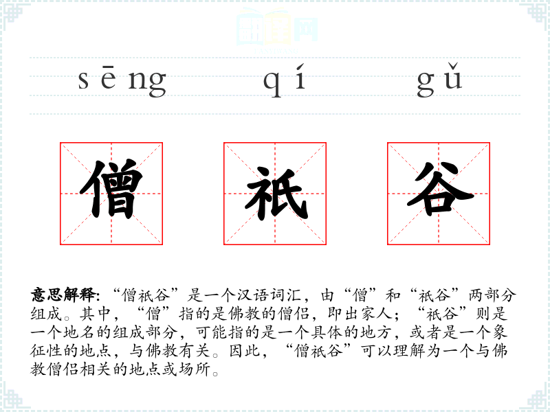 “僧祇谷”是一个汉语词汇,由“僧”和“祇谷”两部分组成。其中,“僧”指的是的僧侣,即出家人;“祇谷”则是一个地名的组成部分,可能指的是一个具体的地方,或者是一个象征性的地点,与有关。因此,“僧祇谷”可以理解为一个与**僧侣相关的地点或场所。