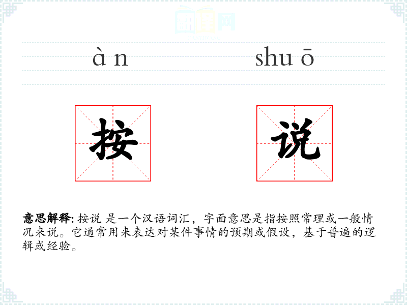 按说 是一个汉语词汇,字面意思是指按照常理或一般情况来说。它通常用来表达对某件事情的预期或假设,基于普遍的逻辑或经验。