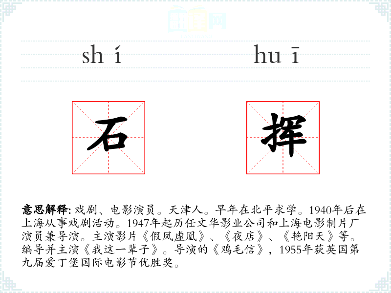 1.戏剧、电影演员。天津人。早年在北平求学。1940年后在上海从事戏剧活动。1947年起历任文华影业公司和上海电影制片厂演员兼导演。主演影片《假凤虚凰》、《夜店》、《艳阳天》等。编导并主演《我这一辈子》。导演的《鸡毛信》,1955年获英国第九届爱丁堡国际电影节优胜奖。