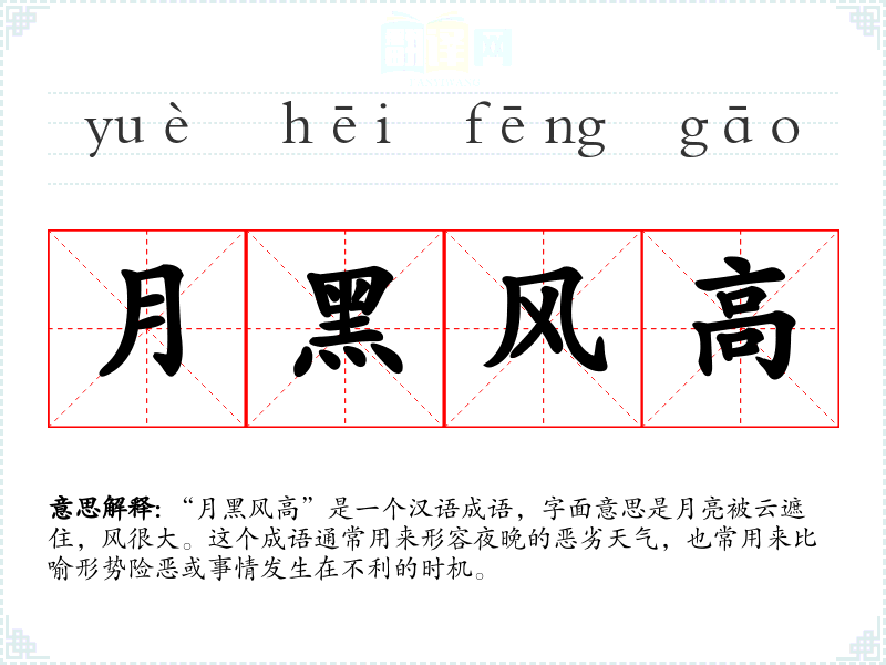 “月黑风高”是一个汉语成语,字面意思是月亮被云遮住,风很大。这个成语通常用来形容夜晚的恶劣天气,也常用来比喻形势险恶或事情发生在不利的时机。