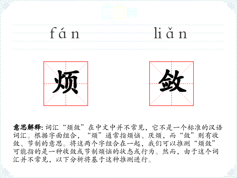 由于“烦敛”不是一个常用词汇,它在不同语境下的使用可能较为有限。在文学作品中,作者可能会创造性地使用这个词汇来描述一个人在困境中保持冷静和自制的状态。在口语中,这个词汇可能不会被广泛使用,除非在特定的讨论心理健康或情绪管理的场合。