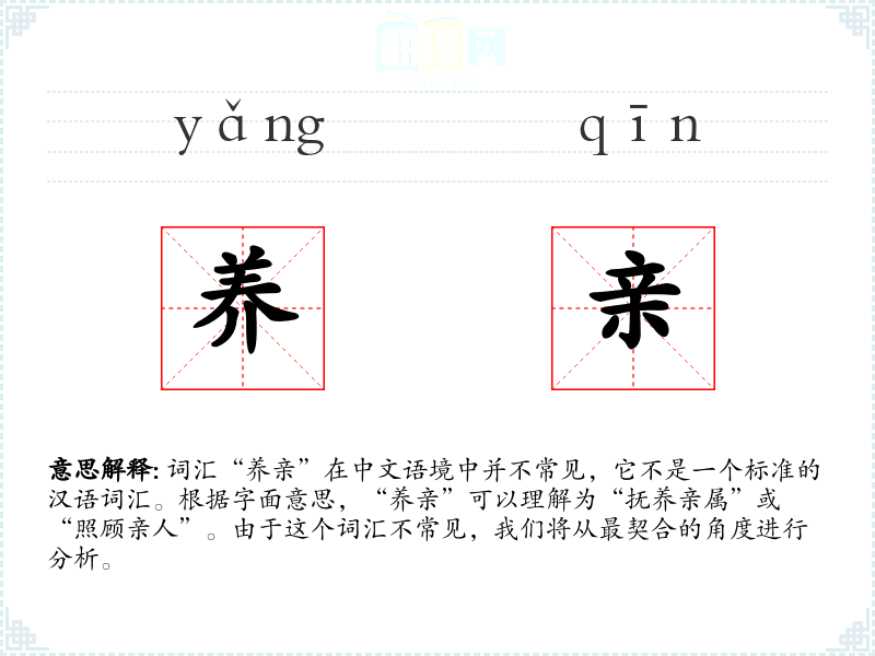 词汇“养亲”在中文语境中并不常见,它不是一个标准的汉语词汇。根据字面意思,“养亲”可以理解为“抚养亲属”或“照顾亲人”。由于这个词汇不常见,我们将从最契合的角度进行分析。