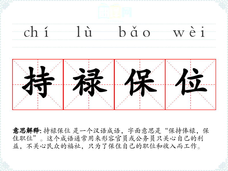 持禄保位 是一个汉语成语,字面意思是“保持俸禄,保住职位”。这个成语通常用来形容官员或公务员只关心自己的利益,不关心民众的福祉,只为了保住自己的职位和收入而工作。