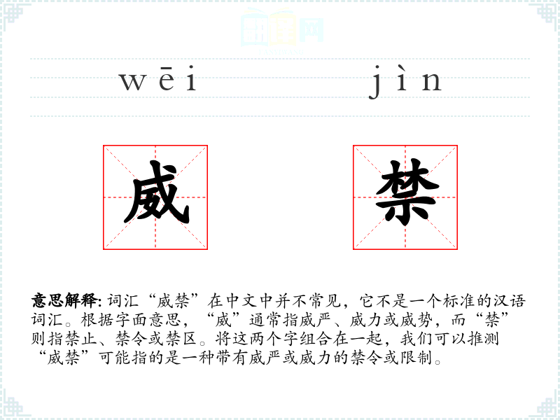 词汇“威禁”在中文中并不常见,它不是一个标准的汉语词汇。根据字面意思,“威”通常指威严、威力或威势,而“禁”则指禁止、禁令或禁区。将这两个字组合在一起,我们可以推测“威禁”可能指的是一种带有威严或威力的禁令或限制。